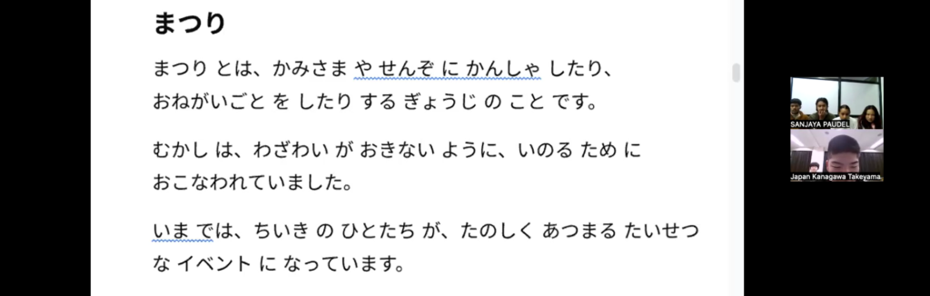 また、日本の文化を紹介する中で、「その日本文化を体験したことはありますか?」「ネパールにも同じような文化はありますか?」といった問いかけが行われました。こうしたやり取りを通して、日本とネパールの文化の違いや共通点に気づく場面が多く見られました。